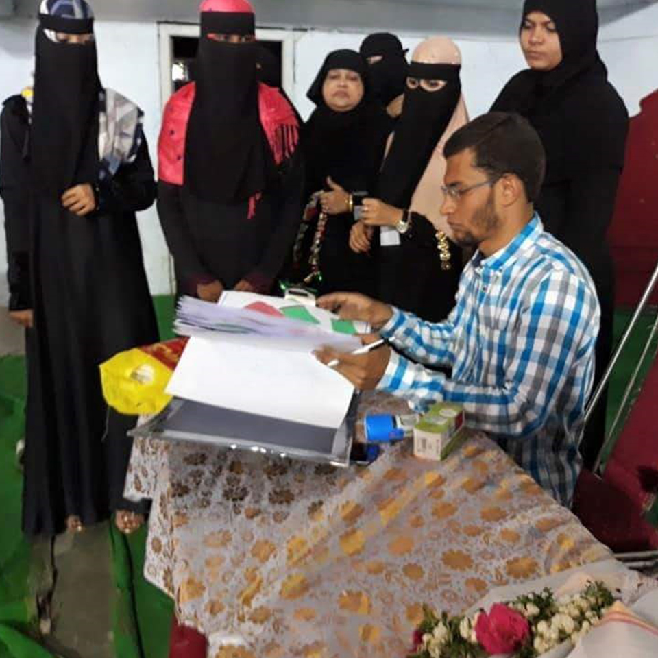 Garments making training to destitute widow for six months duration on cutting, stitching, embroidering, cloth fabrication and marketing. After course completion each woman is provided by a sewing machine and accessories for garments business. They start garments business in their home at small level.